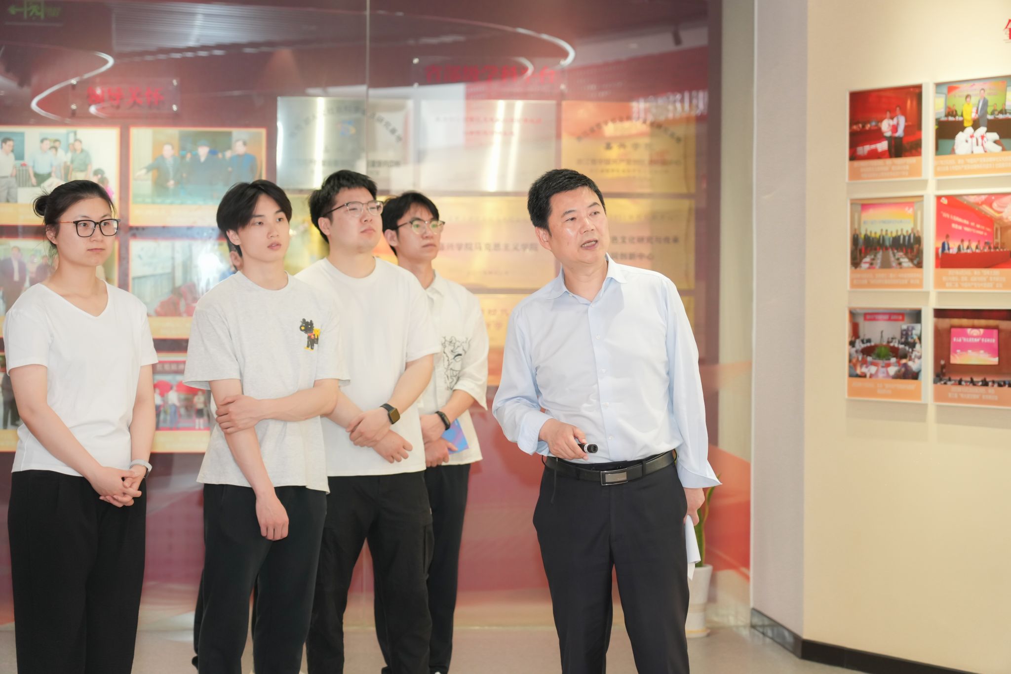 结合展陈内容,沈希阐述了学校在红船精神研究领域的独特优势与显著成果。“中共早期党组织有58名成员、中共一大嘉兴南湖会议于1921年8月3日召开……”他边走边讲,强调嘉兴大学作为革命红船起航地高校,研究红船精神“既是幸运,更是责任”。他勉励在场研究生充分运用学校学科平台优势,深耕学术研究,产出高质量成果,为丰富和发展红船精神的理论体系贡献智慧与力量。