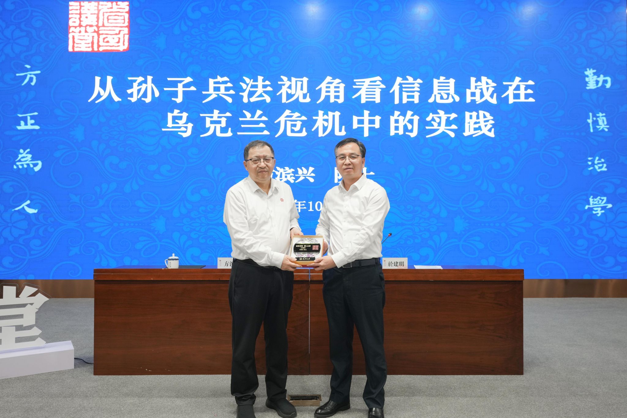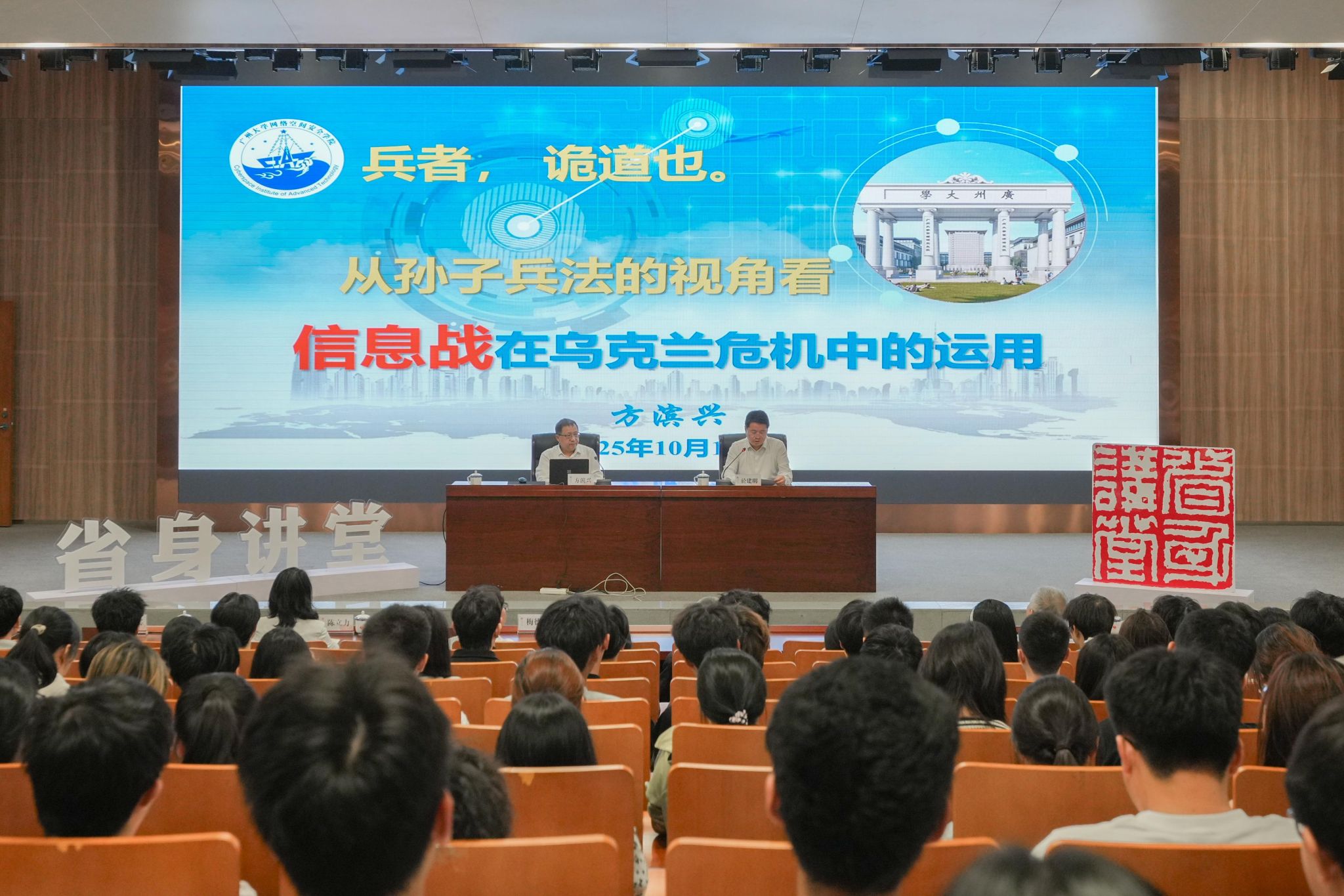 10月18日,中国工程院院士、我国网络空间安全领域的重要开拓者和奠基人方滨兴院士应邀作客我校省身讲堂第148讲,作题为《从孙子兵法视角看信息战在乌克兰危机中的实践》的学术报告。嘉兴大学首任校长、中国工程院院士陆军,校长梅德庆,党委副书记陈立力出席报告会。党委委员、副校长於建明主持报告会。