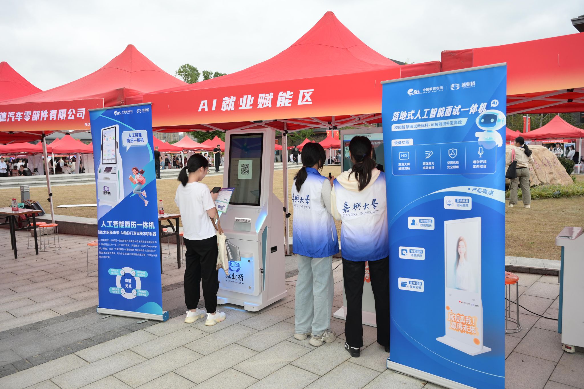 招聘会现场特别设立AI就业赋能区与就业服务区,为学生提供AI模拟面试、AI简历诊断、证件照打印、征兵咨询、留学咨询、就业政策咨询等服务。